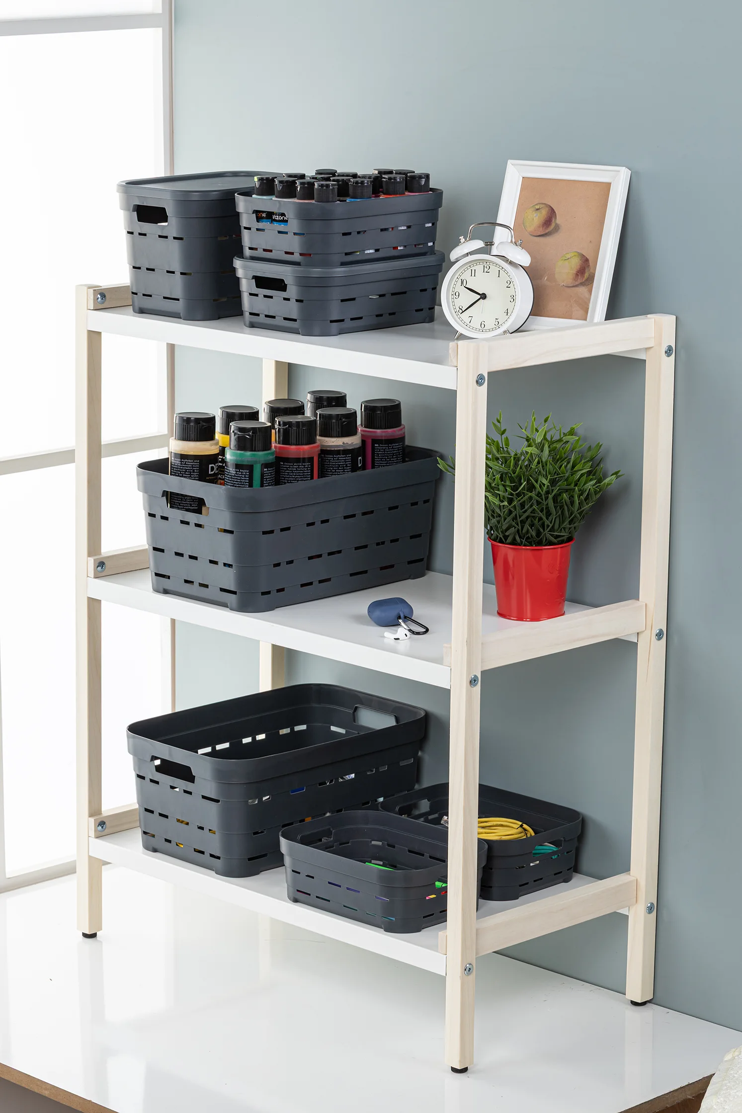 Que ce soit pour organiser vos fournitures de bureau, vos accessoires de salle de bain ou vos ustensiles de cuisine, son design moderne et sa couleur gris anthracite apportent une touche contemporaine à vos étagères.